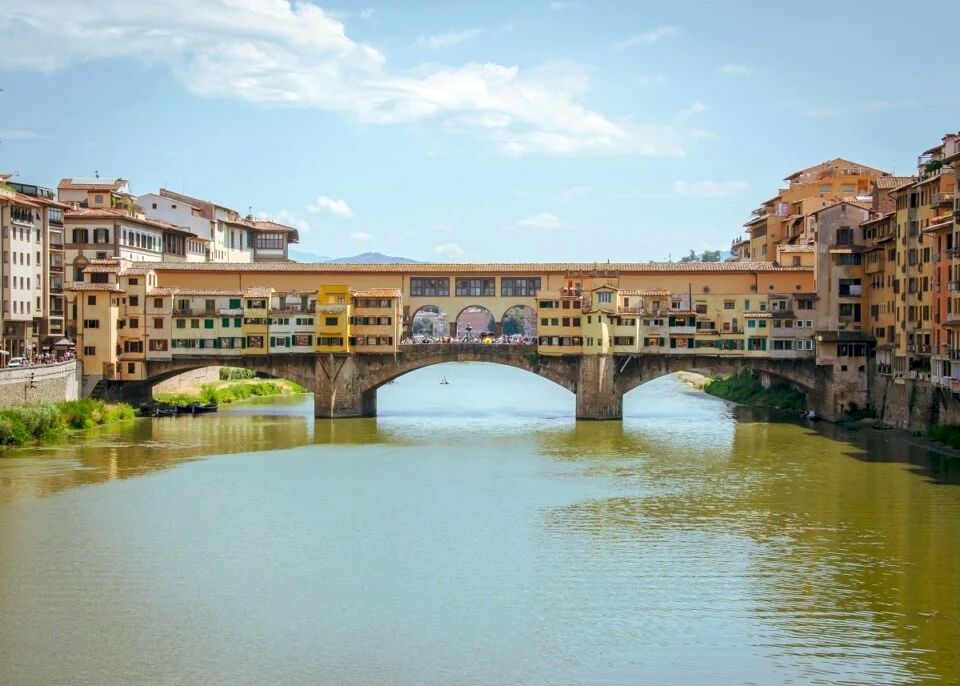 Ponte Vecchio, which translates to Old Bridge, is located in the heart of Florence, and is notable for its unique architecture and rich history. It is considered one of the greatest achievements of European medieval engineering and the oldest European arch bridge. It spans the Arno River and connects the historic center with the lively Olrarno district. Its upper gallery connects the Uffizi Gallery with the Pitti Palace.