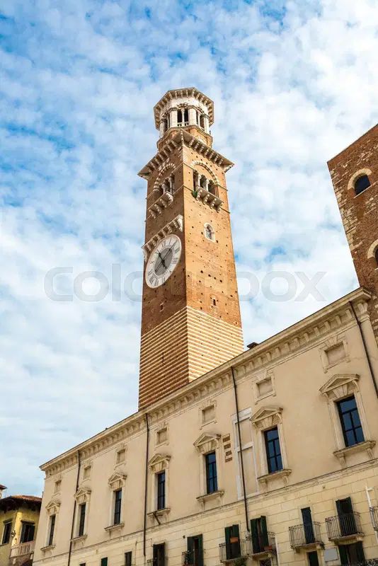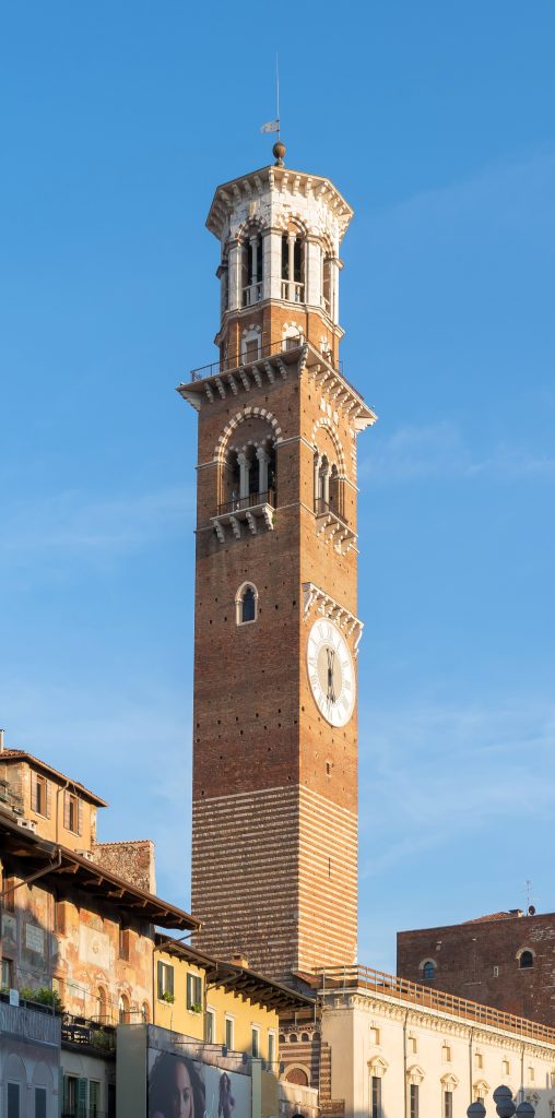 The Torre dei Lamberti is one of the few remaining towers in Verona, each of which would have originally represented the wealth and importance of a particular aristocratic family. This tower was begun in 1171, but was continually built upon, giving it a very distinctive style; the most recent addition is the marble section at the top. These towers helped to organize city life during the Middle Ages, with one bell (the Marangona) ringing to signal the end of the workday or to warn citizens of a fire, and another bell (the Rengo) ringing to summon councils of war.