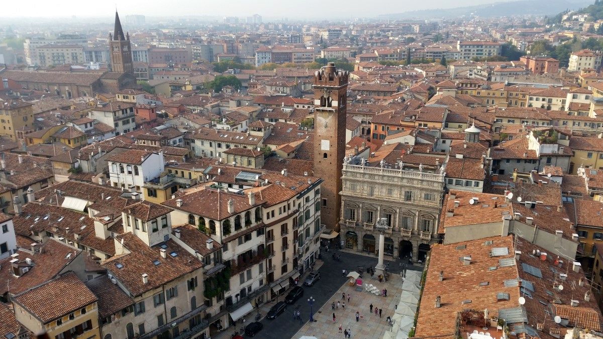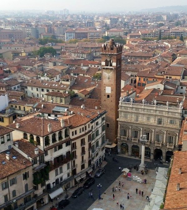 The Torre dei Lamberti is one of the few remaining towers in Verona, each of which would have originally represented the wealth and importance of a particular aristocratic family. This tower was begun in 1171, but was continually built upon, giving it a very distinctive style; the most recent addition is the marble section at the top. These towers helped to organize city life during the Middle Ages, with one bell (the Marangona) ringing to signal the end of the workday or to warn citizens of a fire, and another bell (the Rengo) ringing to summon councils of war.